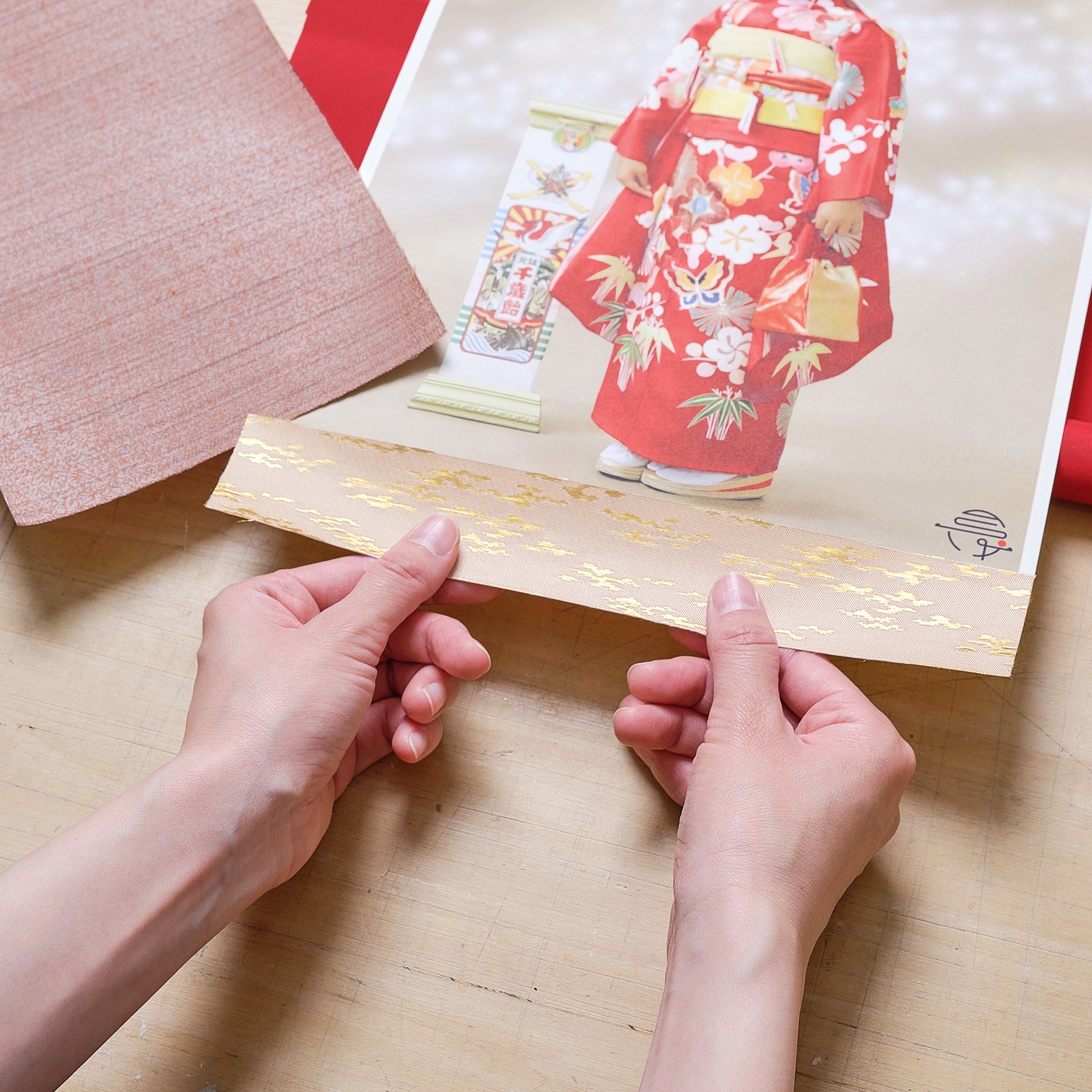 ご自身の手で掛け軸を作り上げる、特別な時間をご用意しています。 制作キットを用いてスタッフが丁寧にサポート。完成した掛け軸は、専用の箱に入れてその日にお持ち帰りいただけます。旅の思い出や、心を整えるアクティビティとして人気です。